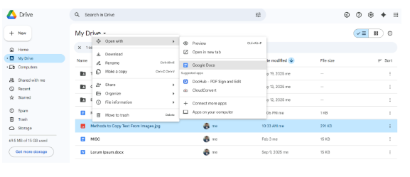 Another way to copy text from photos is to use Google Drive. Upload your image to Google Drive. After uploading, right-click that image and open it with Google Docs. A new document will open, with the image and text separated, so you can copy them easily.