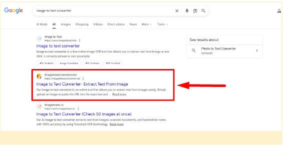 To copy text from an image, open any browser and search for ‘image to text converter’. Next, open Imagetotextconverter.net and upload the image to the tool. After uploading, click ‘Convert to Text’ to display the results. From the result, click the copy icon to copy all text extracted from the image instantly.