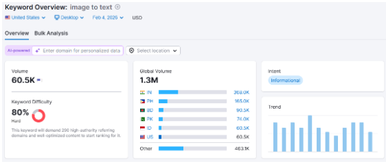 And this is not what we claim. If you search for the image to text query on tools like SEMRush, you will find that over a million people worldwide search for an image to text converter each month (screenshot attached below for your reference). The purpose behind it is just to extract and copy text from images.